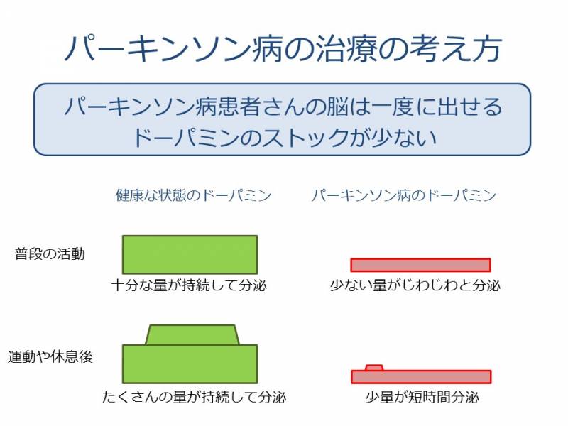 これには、「パーキンソン病患者さんの脳は一度に出せるドーパミンのストック(貯蔵庫)が少ない」ことがあります。つまり、健康な状態の脳は「たくさんのドーパミンを持続して分泌」できますが、パーキンソン病では「少ない量のドーパミンがじわじわとしか分泌」されず、ドーパミンが増えやすい運動や休憩の後にも「少ない量のドーパミンが短時間しか分泌」されません。ドーパミンの分泌が少ないと、疲労によってドーパミンがすぐに枯渇してしまうために、ふるえる・動きにくいといった「調子が悪い状態」なると考えています。