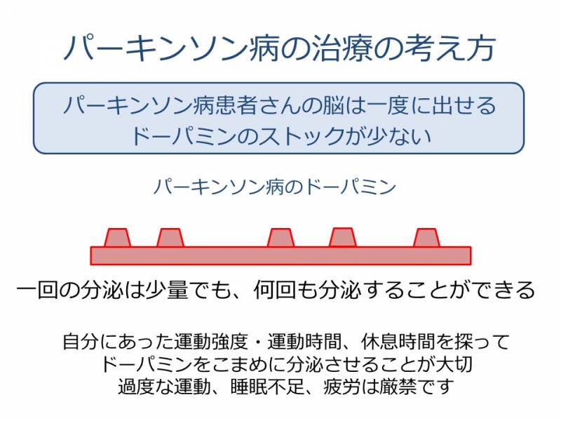 そのためには、自分にあった運動強度・運動時間、休息時間を探って、「ドーパミンをこまめに分泌させる」ことが大切になります。ドーパミンの減りやすい「過度な運動」「睡眠不足」「疲労」は避けたいものです。診察のときに、「よく眠れていますか」「軽い運動はできていますか」「疲労が翌日に溜まっていませんか」と尋ねるのはそのような理由のためです。ドーパミンのストックは患者さんによってまちまちですので、診察を重ねていきながら、上手に探っていきたいものです。